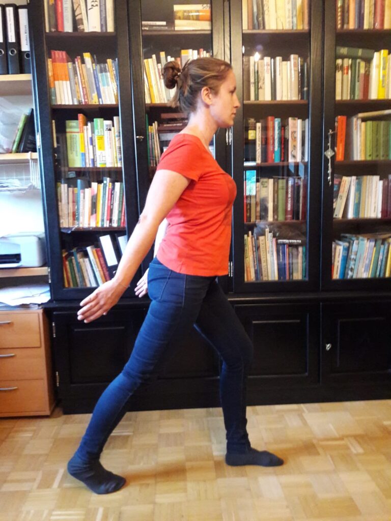 Sie stellen in einen Ausfallschritt, das Körpergewicht auf dem vorne stehenden Bein, das nach hinten gestreckte Bein mit der Ferse abgehoben. Sie drücken die Ferse des rückwärtig stehenden Beines beim Ausatmen zum Boden und spüren vielleicht ein leichtes Ziehen in der Wade. Sie „atmen“ in die Längung hinein und damit die Spannung gleichsam aus. Bei Einatmen zurück zur Ausgangsstellung. Einige Wiederholungen, dann Seitenwechsel.
